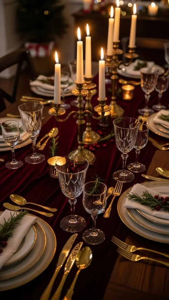 A velvet ribbon runner is simple but adds style. Choose multiple ribbon strips in similar colors and lay them side-by-side down the center of the table. Burgundy, emerald, or navy ribbons work well for winter holidays. This DIY idea is inexpensive, and you can rearrange the ribbons each year for a new look. Pair the runner with gold accents, greenery, or matte plates for a warm feel.
