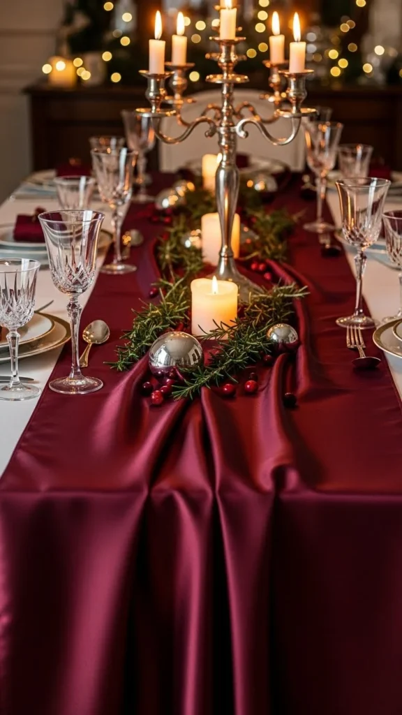 A satin silk runner creates a smooth, flowing look that feels elegant but not overly formal. Choose soft shades like champagne, pearl, or light gold for a warm holiday style. Satin drapes beautifully, so you can let the ends hang off the table for a soft finish. Pair it with glass candle holders or white flowers for a clean look. If you don’t want to buy a premade runner, satin fabric by the yard works just as well. Press the fabric lightly before setting it out so it lays flat. Satin also works nicely with greenery because the contrast in texture adds balance. This style is perfect for holiday dinners where you want a soft, classic table.
