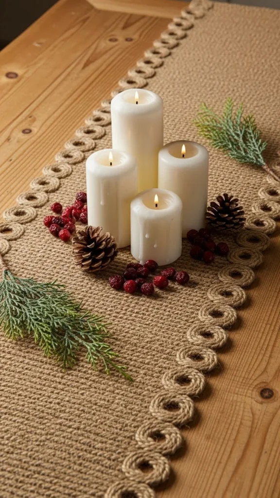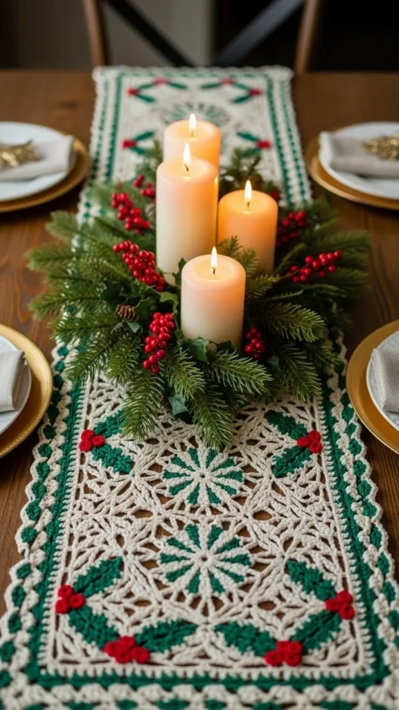 A crochet runner adds a handmade touch that feels personal and inviting. You can choose white for a snowy look or pick deeper colors like pine or cranberry. If you enjoy crafting, crocheting your own runner is an affordable option. If not, you can find beautiful ones online or in home décor shops. Crochet patterns bring texture without overwhelming the table, so you can keep the rest of the décor simple. Pair it with ceramic dishes, brass details, or soft lights for a cozy atmosphere. This runner style works well for family dinners, especially when you want the table to feel warm and thoughtful.