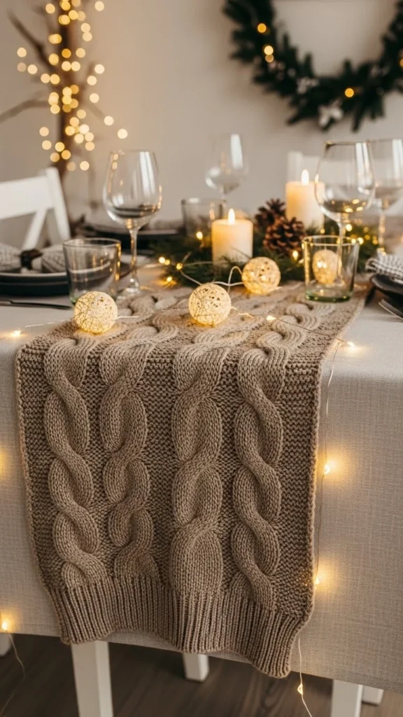 A knit runner feels cozy and perfect for winter. You can repurpose an old sweater by cutting it open and flattening it into a runner. Look for cable-knit patterns or chunky knits that add texture. Neutral colors like cream or grey work best for a clean look. Pair it with wood, greenery, and candles for a warm holiday atmosphere. Sweater runners work best on smaller tables because they add volume. If you want extra warmth, mix it with natural elements like pine branches or cinnamon sticks. This idea is budget-friendly and easy to personalize, making it great for casual or intimate gatherings.