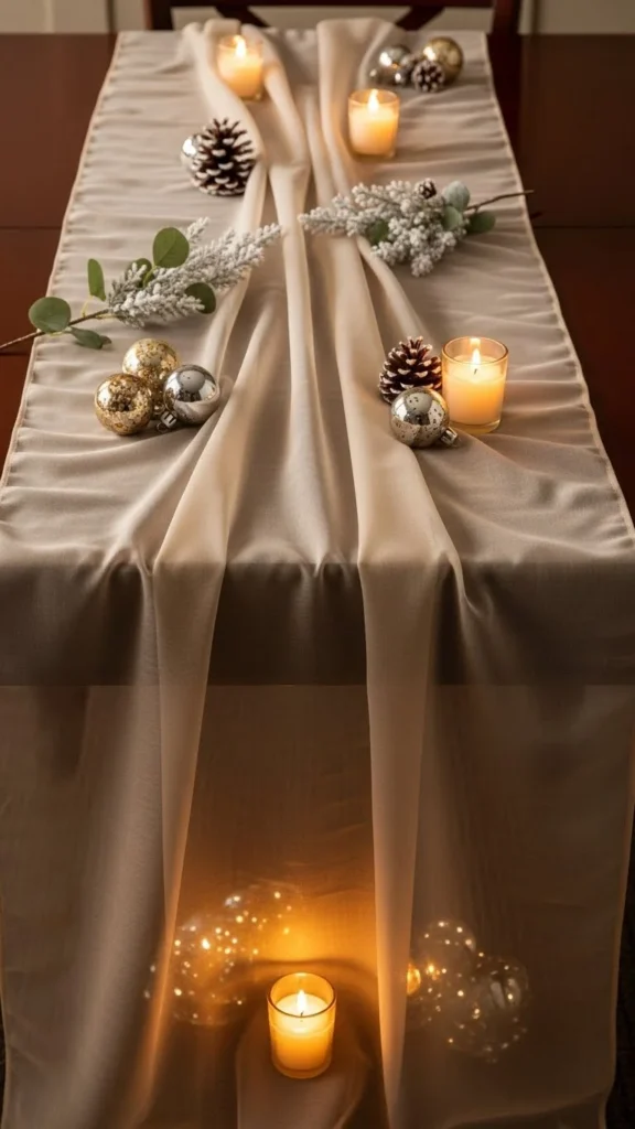 A sheer runner adds soft movement without hiding your table. Champagne, beige, or blush shades work nicely for holiday dinners because they add warmth. Sheer fabric is easy to find and usually inexpensive. Let the ends drape loosely for a romantic style. Pair it with gold flatware, warm lights, and small floral touches. You can layer two sheer runners for a fuller look or weave in thin greenery for added texture. This runner is great when you want a light, airy style that feels calm and polished.