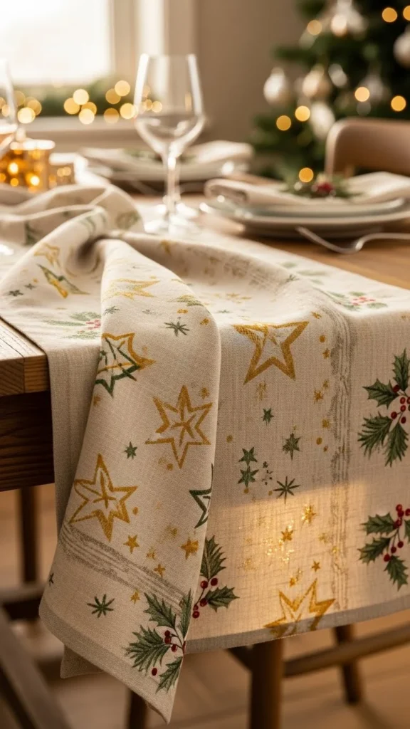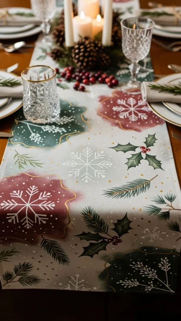 A seasonal pattern runner brings a light holiday touch without feeling loud. Look for prints like subtle holly branches, stars, winter berries, or snowflakes. Neutral backgrounds such as cream or grey help the table feel calm. Pair patterned runners with plain plates and simple greenery so the design stays the main focus. You can also match the runner with cloth napkins for a coordinated look. This idea is great if you like holiday themes but prefer softer designs rather than bright red décor.
