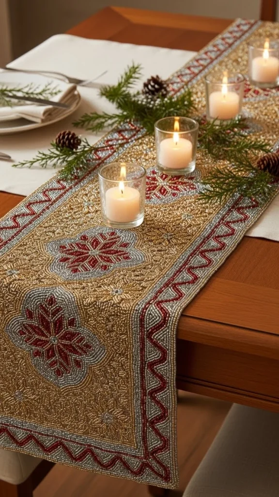 A beaded runner adds shine and texture to your holiday table. Beads reflect light beautifully, especially under candles or string lights. Choose a neutral tone like white, champagne, or soft gold to keep it elegant. Because this style is detailed, the rest of the table décor should stay simple—clean plates, greenery, and a few candles are enough. Beaded runners are usually more delicate, so handle them gently. If you want a budget alternative, choose a beaded placemat and align three of them down the center of the table to mimic the look of a runner.