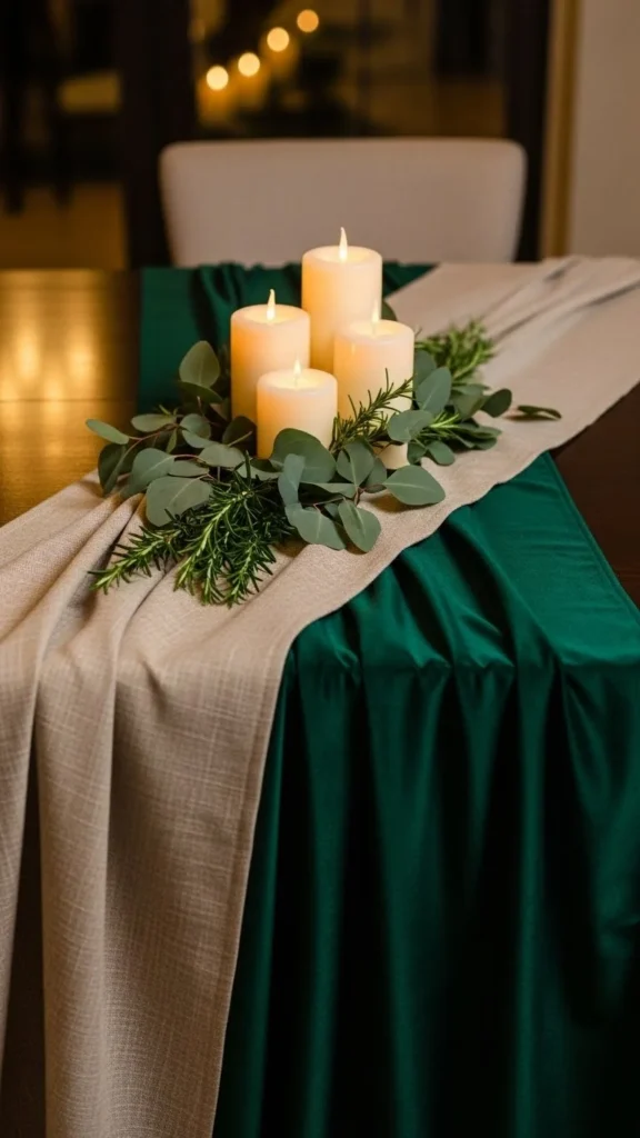 A dual-layer runner adds depth and color to your holiday table. Combine two fabrics that contrast—like satin and lace, linen and mesh, or velvet and sheer cloth. Lay one runner slightly narrower on top of the other to create a layered effect. Choose colors that complement your décor. For example, cream over gold or sage over white. This idea works well when you want more texture or want to add color without using bold decorations. It’s an affordable way to refresh older runners you already own.
