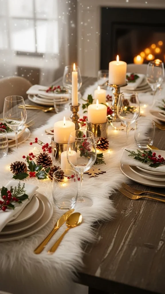 A faux fur table runner adds comfort and winter charm without looking too heavy. White or cream is the most popular choice because it brightens the table and works with any dinnerware. Faux fur by the yard is affordable and easy to cut to your table length. Pair it with wood chargers, matte flatware, and soft lights for a clean winter look. If your table is dark, the contrast will stand out even more. Keep décor simple so the texture stays the main focus. A small cluster of candles or mini trees is enough. This runner is especially nice for casual gatherings where you want the table to feel warm and inviting without using traditional red and green themes.