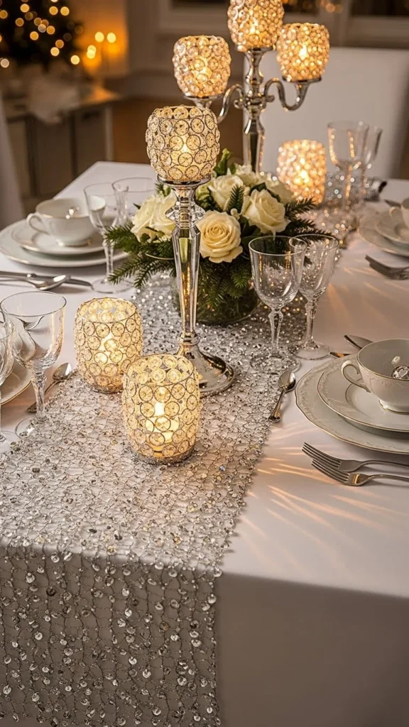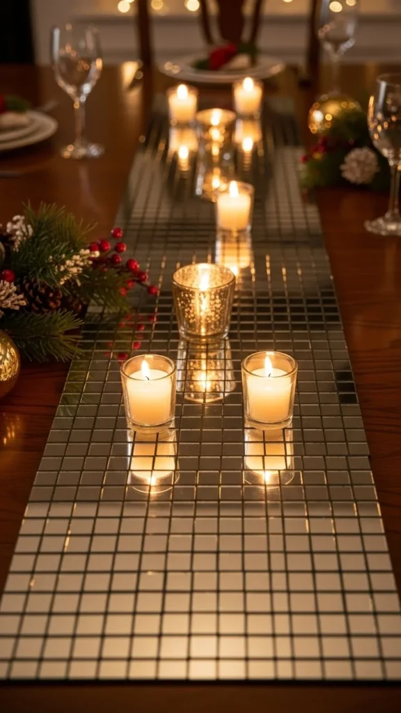 A mirror tile runner creates a bright, reflective look. You can use mirrored tiles or mirrored placemats arranged in a line. The tiles bounce candlelight, making the whole table glow. Pair this runner with simple décor so the reflective surface stays the focus. Clear ornaments, soft greenery, or white dishes work best. This idea is perfect for evening dinners or New Year’s celebrations.
