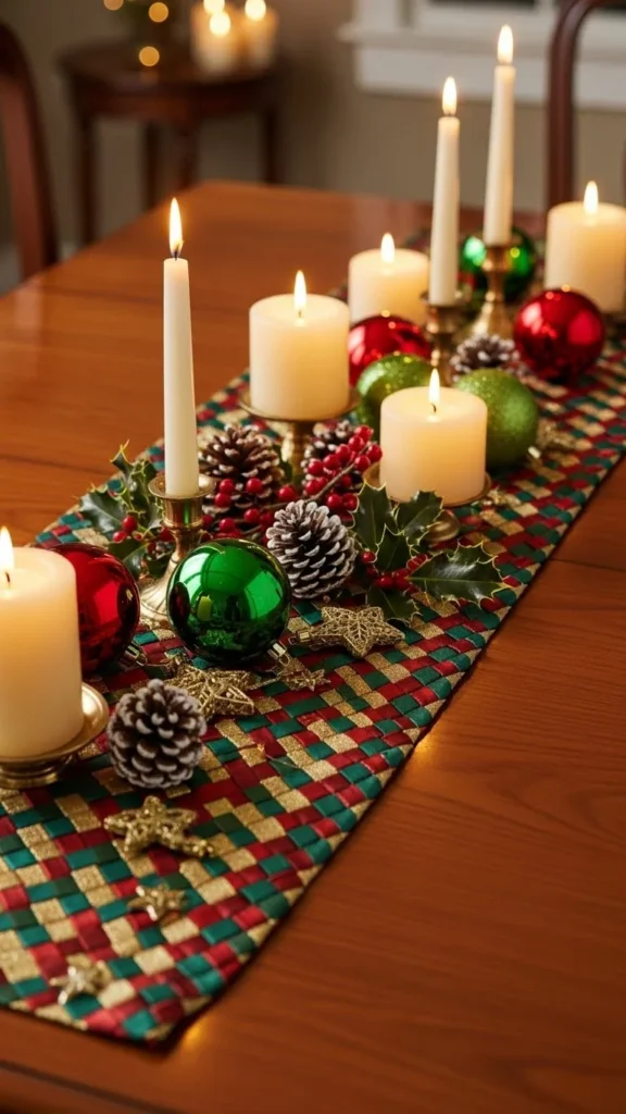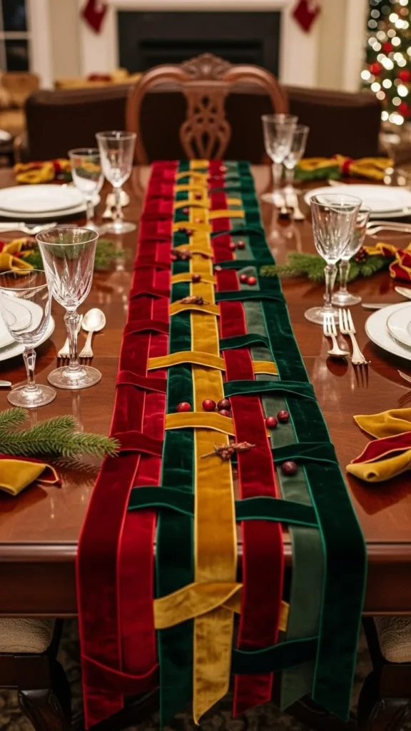 A ribbon-weave runner adds texture with very little cost. Choose ribbons in your holiday colors and weave them into a simple mat. You can tape the back or glue the edges to secure it. Ribbons in shades of gold, white, or green create a classic holiday look. Pair the runner with neutral dishes and candles. This idea is perfect for people who enjoy crafting and want something unique but simple to make.