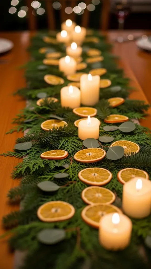 A dried orange runner adds color and a light citrus scent to your holiday table. Arrange dried orange slices along the table and weave greenery through the gaps. Add cinnamon sticks or star anise for extra warmth. This setup is inexpensive and easy to assemble. Pair it with neutral dishes, wood décor, and warm candles. It feels festive without being overly bright or traditional.