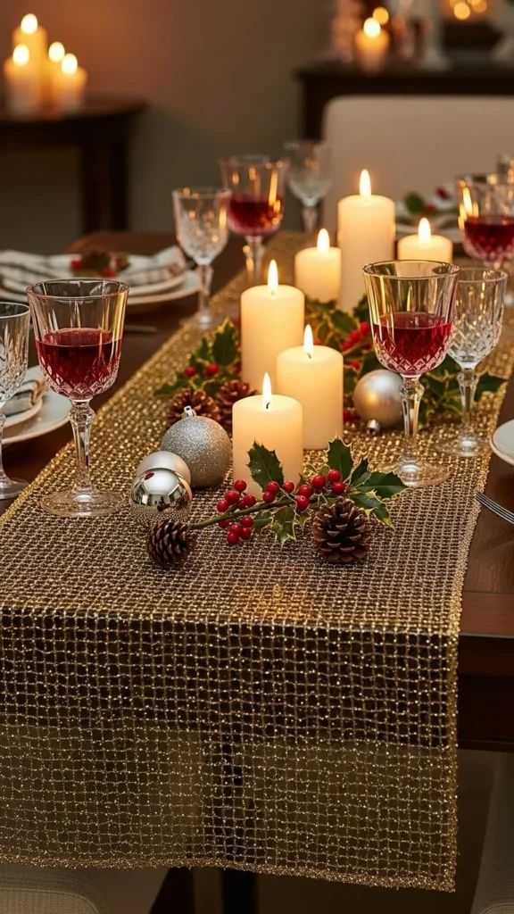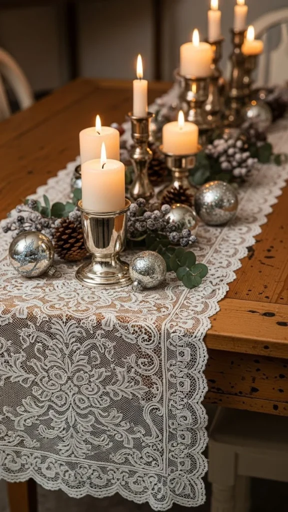 A lace runner adds charm and softness to the table. White or cream lace works well for winter holidays because it resembles snow patterns. You can layer it over a solid tablecloth or place it directly on the table for a subtle design. Lace is usually inexpensive and available in wide rolls at craft stores. Add vintage touches like brass candlesticks or small ceramic houses to complete the look. If you want something more romantic, mix lace with greenery or fairy lights. This runner style is perfect for smaller dinner settings where you want the table to feel cozy and detailed without using bold colors.