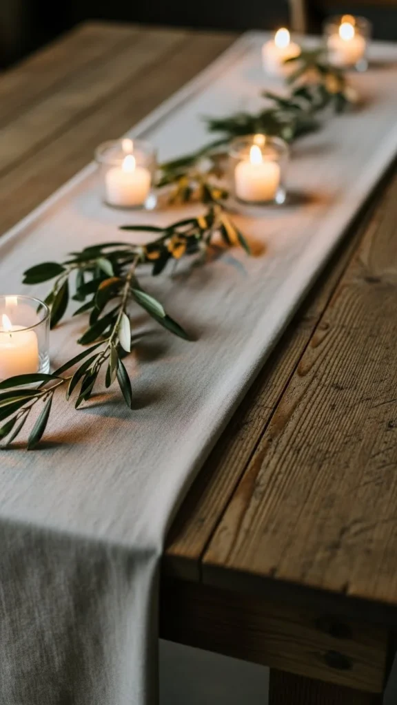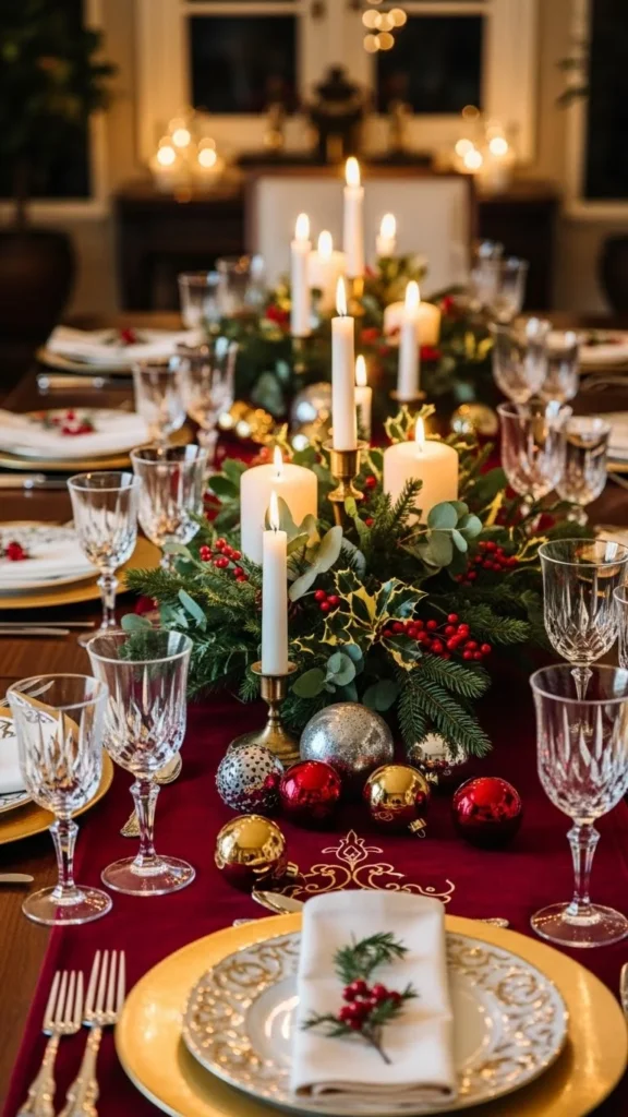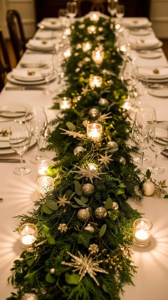 A greenery garland works as a full runner and adds a natural touch to your holiday table. You can use fresh eucalyptus, pine, or cedar, or choose faux greenery for long-term use. Lay the stems directly on the table and let them fall naturally. Add berries, pinecones, or ornaments to tie in holiday colors. Keep décor low so guests can talk across the table comfortably. If you want a soft glow, tuck in small LED lights. Fresh greenery also adds a light scent that makes the dinner feel special. This style is perfect for long tables, but you can scale it down by using smaller branches or combining real and faux stems to control the volume.