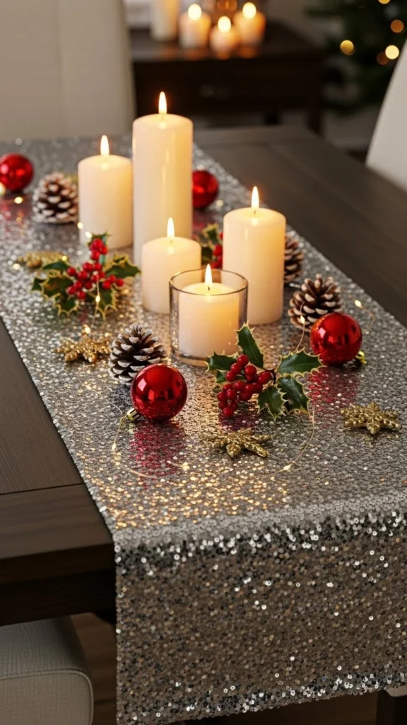 A sequin runner adds shine and movement to the table. Choose silver, champagne, or rose gold for a softer sparkle that still feels festive. Sequins catch the light easily, so pair the runner with simple décor like white plates and clear glasses. You can also add a few metallic ornaments to keep the theme consistent. Sequin runners are easy to reuse for birthdays or New Year’s Eve celebrations, making them a smart purchase. If you want to make your own, buy sequin fabric by the yard and cut it to fit your table. It doesn’t need hemming because the fabric holds up well on its own. This style is great when you want the table to feel festive without adding too many accessories.