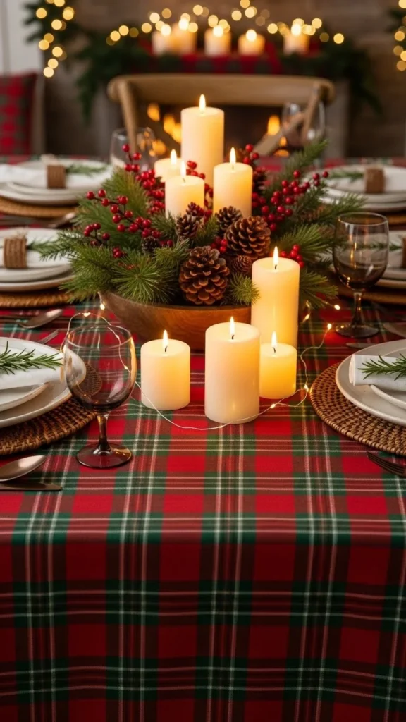A plaid runner brings a classic holiday look to the table. Red and green are traditional, but black-and-white or navy-and-red patterns work well for a more modern feel. Plaid fabric is easy to find and usually affordable. Pair it with plain white dishes and simple greenery so the pattern stands out. You can also add small touches like pinecones or cranberries for a warm holiday look. If your table is wooden, the plaid will add color without feeling overwhelming. Cut the fabric by the yard and leave the edges raw for a casual look or hem them if you want a cleaner finish. This idea is perfect for family dinners and relaxed holiday gatherings.
