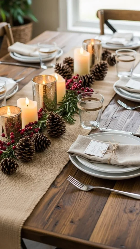 A burlap runner creates a natural, rustic style that works well with wood tables. Its texture adds character without making the table feel too formal. You can buy burlap fabric cheaply and cut it to size. The frayed edges give it a relaxed, handmade look. Pair burlap with pinecones, wooden chargers, and neutral plates. If you want more color, add red berries or mini ornaments. Burlap also works well as a base for greenery because it creates contrast. This runner is easy to store and reuse for other gatherings like fall dinners or outdoor parties. It’s a great option if you want something simple, practical, and warm for holiday guests.