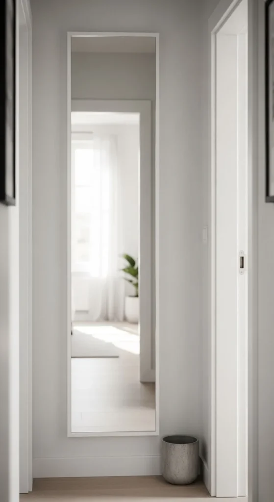 Hallways often feel tight and dark. A tall narrow mirror stretches the space visually.
