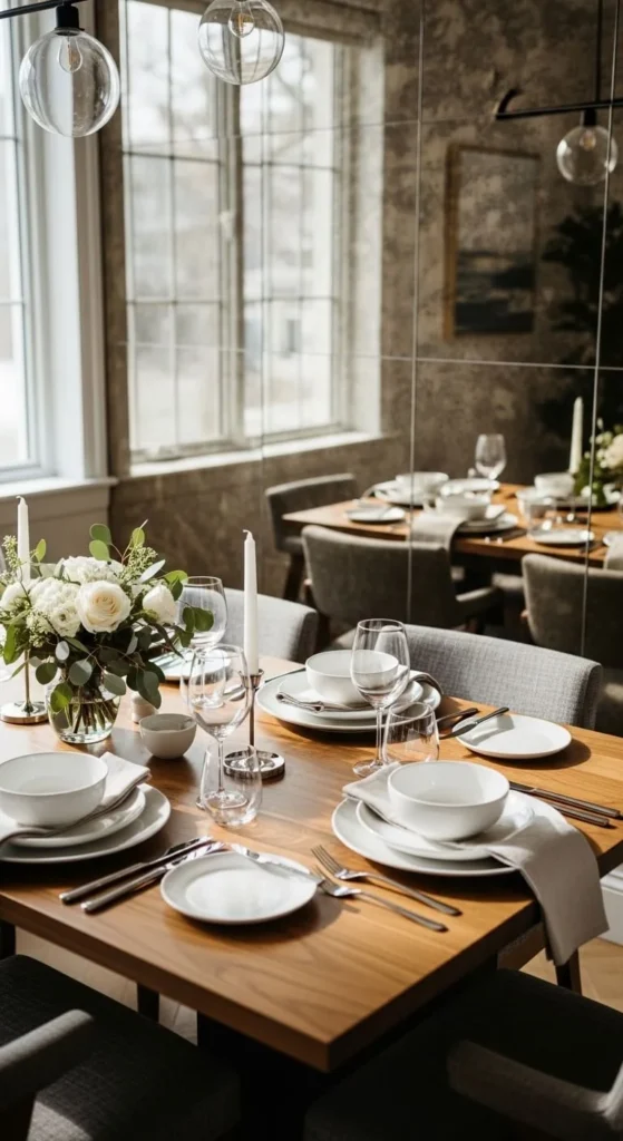 A mirrored backsplash isn’t just for kitchens. In a dining area, it creates depth behind a table.
