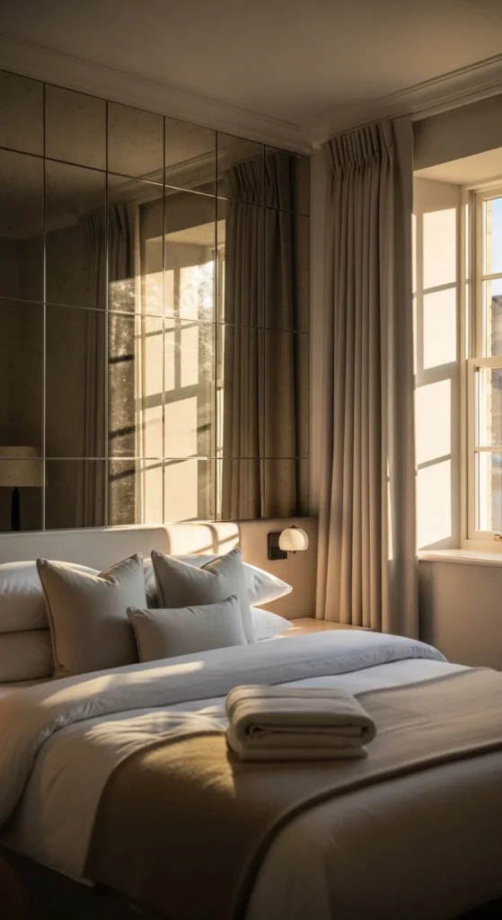 If full mirrors feel bold, try smaller framed pieces arranged behind the bed.