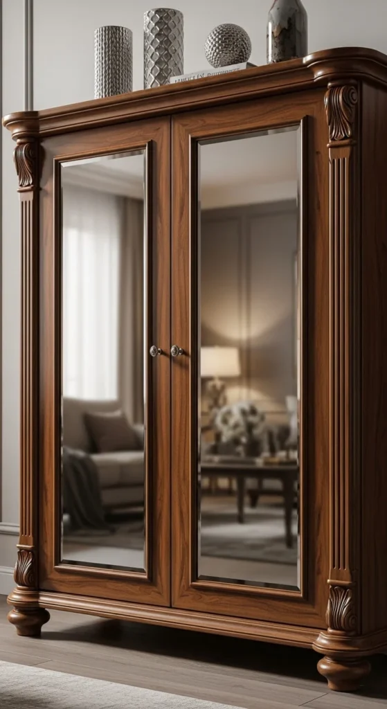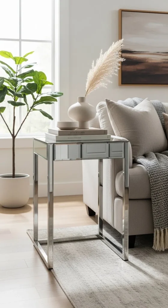 Mirrored furniture reflects light from multiple angles. A mirrored side table or dresser adds shine without extra decor.