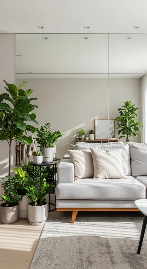 Adding a mirror behind your sofa creates instant depth. It makes the wall feel less heavy and more open.