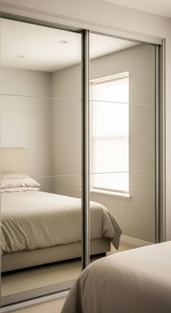 Sliding mirrored doors reflect the entire room. This makes small bedrooms feel twice as large.