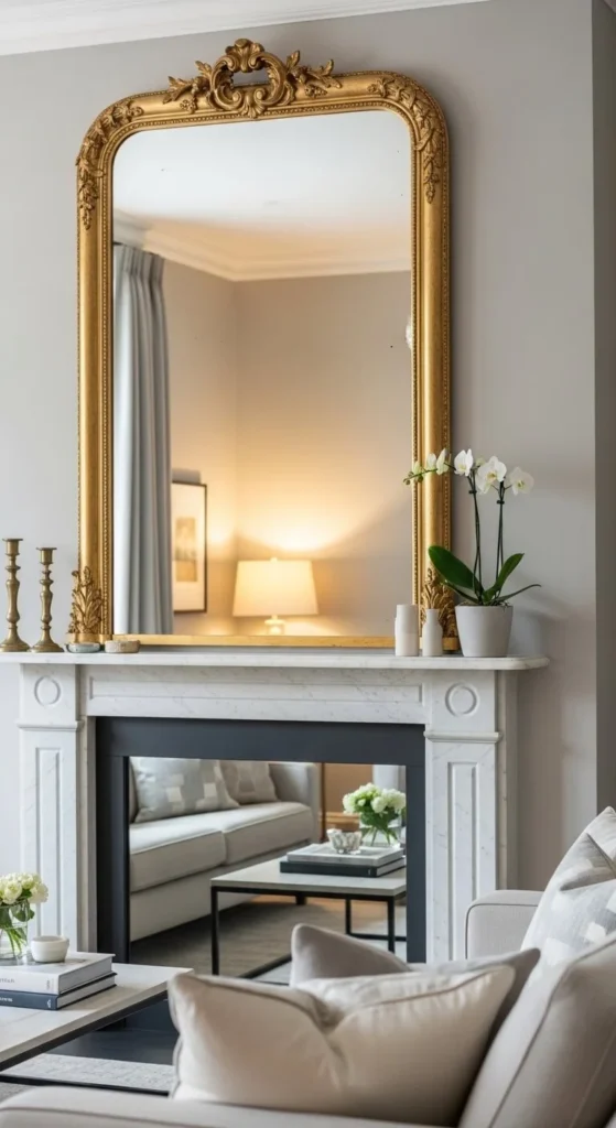 Choose a mirror slightly smaller than the mantel width. This keeps proportions balanced.