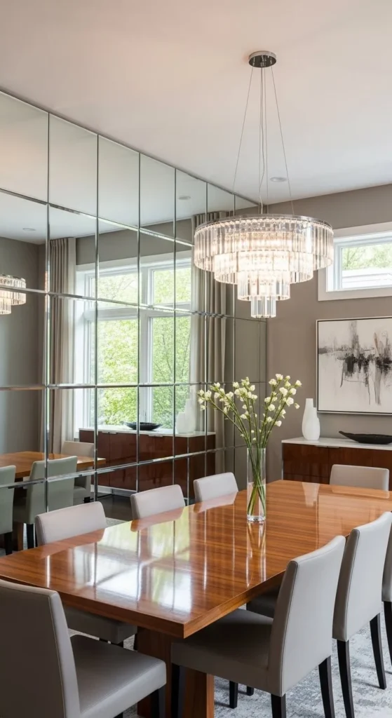 Covering one full wall with mirror panels dramatically expands a room. It visually doubles your dining or living area.