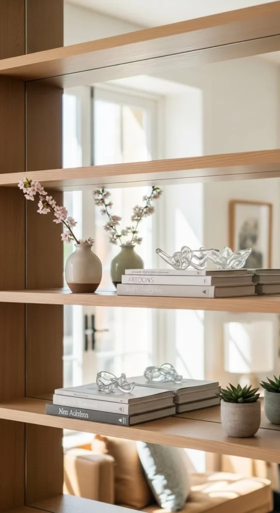 Installing a mirror behind open shelves adds hidden depth. It makes the wall appear farther back.
