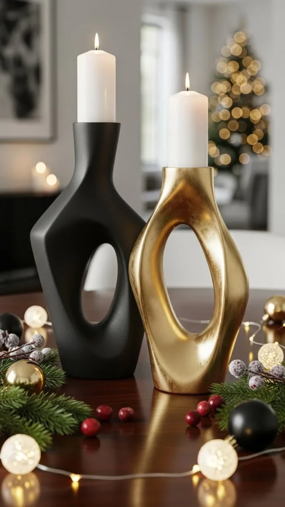 Sculptural candle holders instantly set a modern tone. Their clean shapes add visual interest without color overload. Place two or three on a console or dining table and mix matte finishes with light metallics.