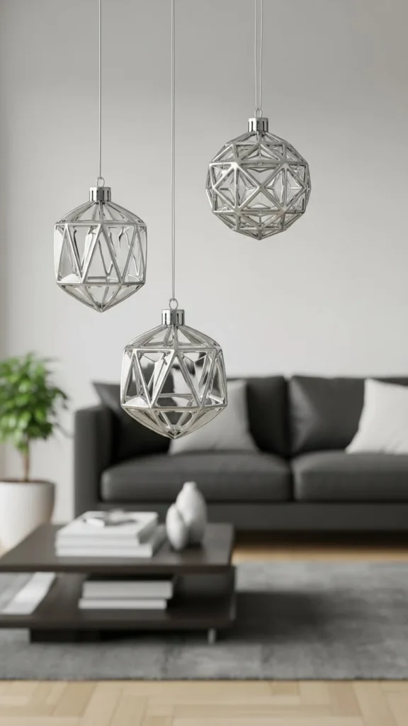 Geometric ornaments feel modern and sculptural. Choose shapes like spheres, cubes, and elongated teardrops.