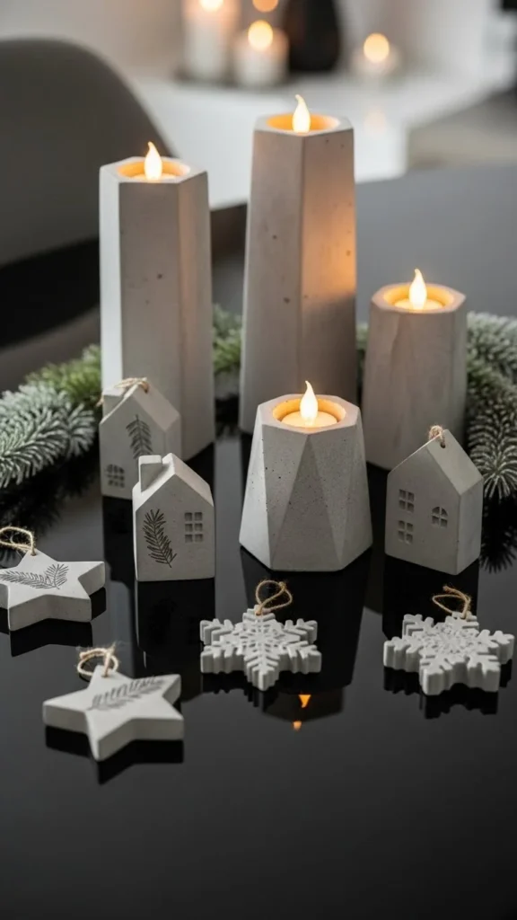 You can make your own concrete ornaments using silicone molds and quick-dry cement. Keep them plain or paint the edges with metallic paint for a softer touch. Concrete accents pair well with greenery and warm lighting.