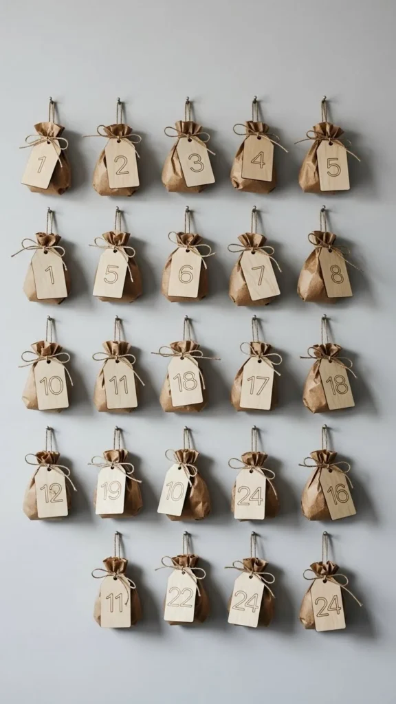 A modern advent calendar uses simple shapes and natural materials. Try kraft bags, plain envelopes, or linen pockets.