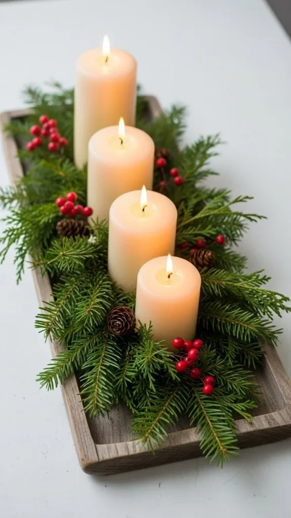 A modern holiday centerpiece is clean and low-profile. Use a wooden tray, a few candles, and soft greenery.