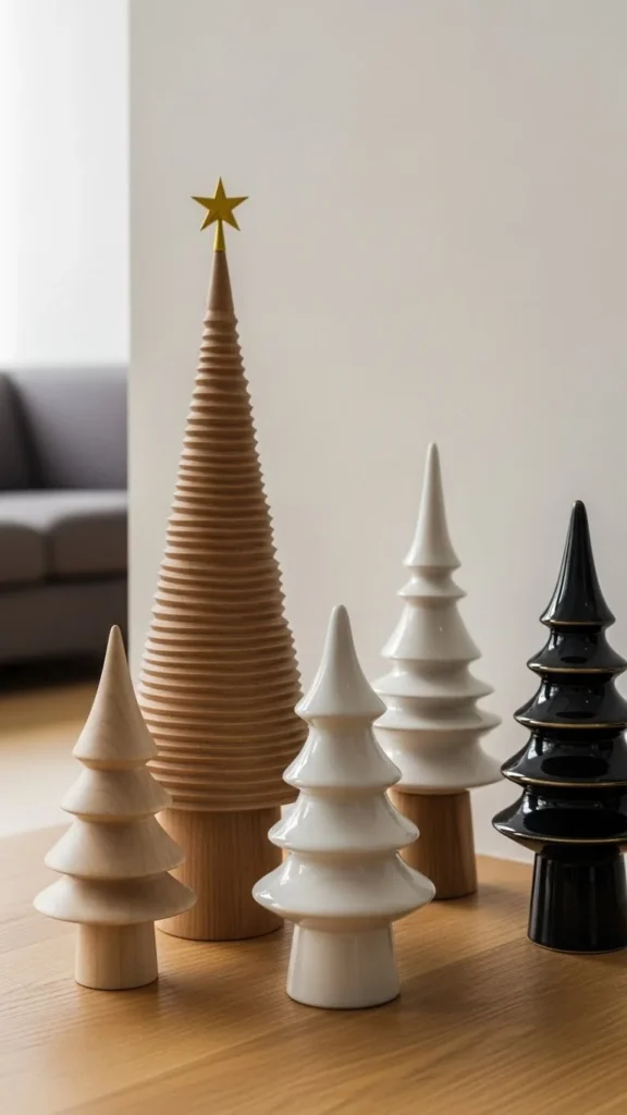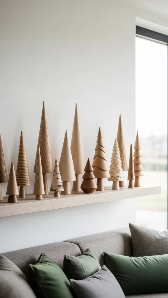 Place them beside candles or greenery. If you enjoy DIY crafts, cut tree shapes from plywood and sand the edges smooth. Wooden accents soften the space without adding colour.