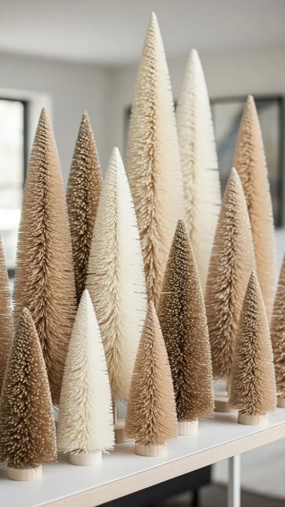 Choose beige, champagne, and white trees. Group them on trays or mantels. You can even dye plain white ones using fabric dye for custom colours. Their texture adds dimension to your décor.