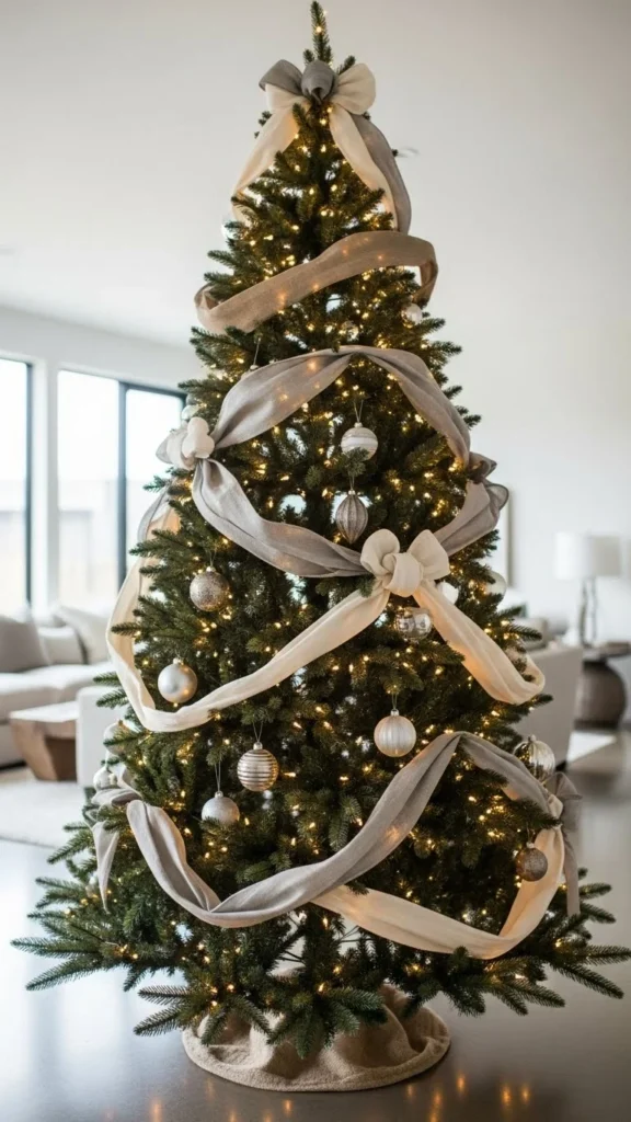 Oversized ribbon gives your tree a soft, modern flow. Choose wide ribbon in linen, velvet, or matte satin.