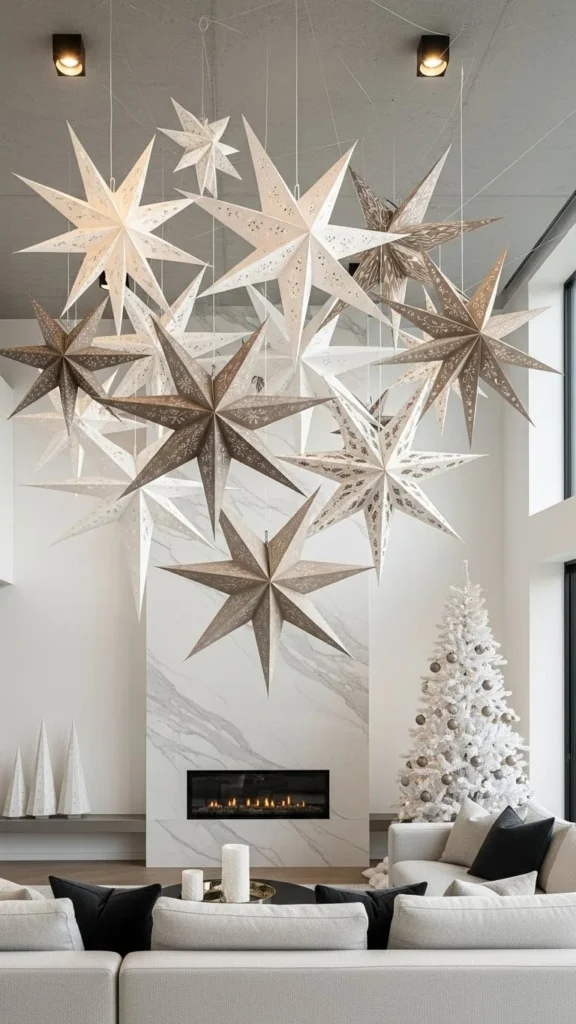 Paper stars look stylish and airy. Use neutral colours and hang them in groups at different heights.