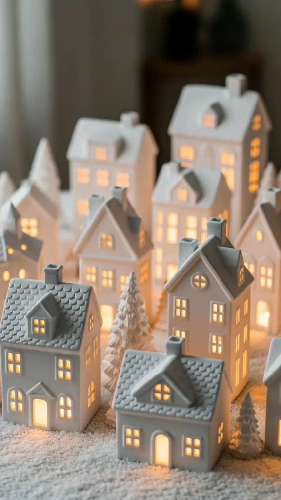 Choose matte white pieces for a modern look. Display them on shelves or mantels. If you want a DIY version, paint thrifted houses in white chalk paint for a clean finish.