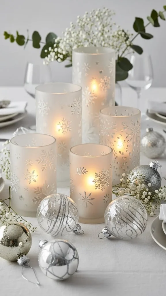 Frosted glass adds a calm, muted glow. Use vases, candle holders, or ornaments made of frosted glass.