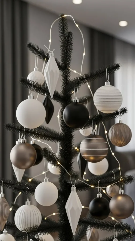 Stick to matte or frosted finishes. You can hang them on the tree or place them in bowls on tabletops. If you want a DIY version, fold paper into geometric shapes and string them with thin twine.