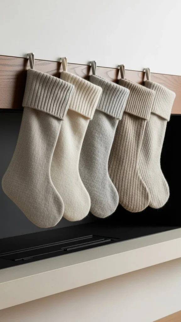 Keep them simple with no heavy embroidery or prints. Add a small ribbon loop if you want a light accent. For an affordable option, sew stockings from leftover fabric or repurpose old sweaters. Hang them with clean hooks to keep your space looking tidy.