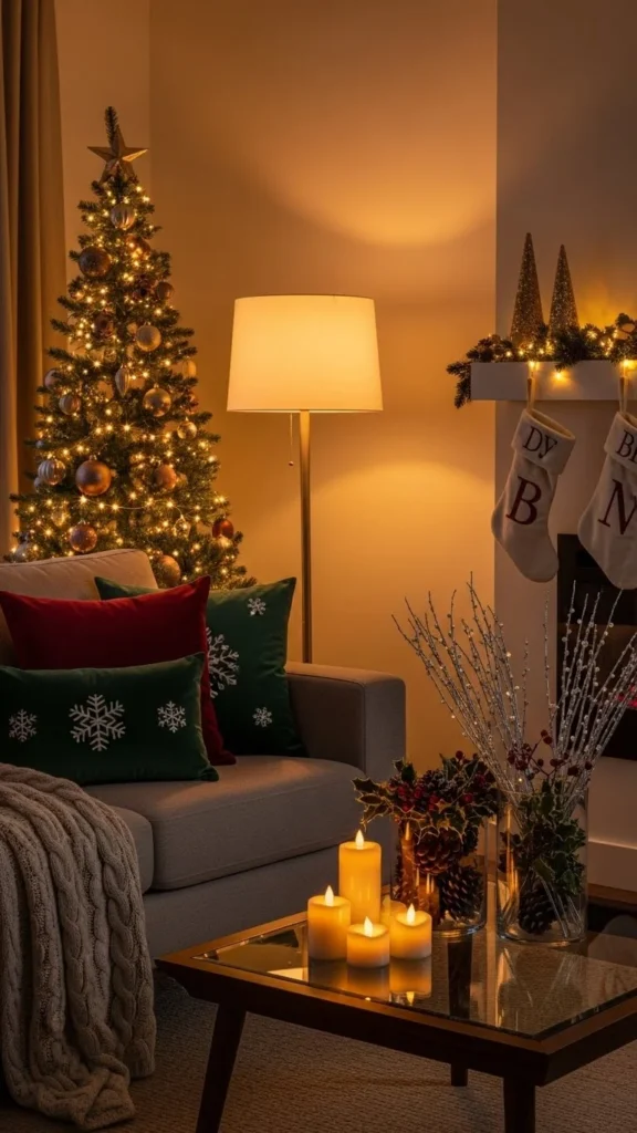 Place string lights behind sheer curtains or along a shelf. Choose warm white shades for a modern look. Battery lights help if you don’t want visible cords. Lighting is one of the easiest ways to shape a calm holiday atmosphere.