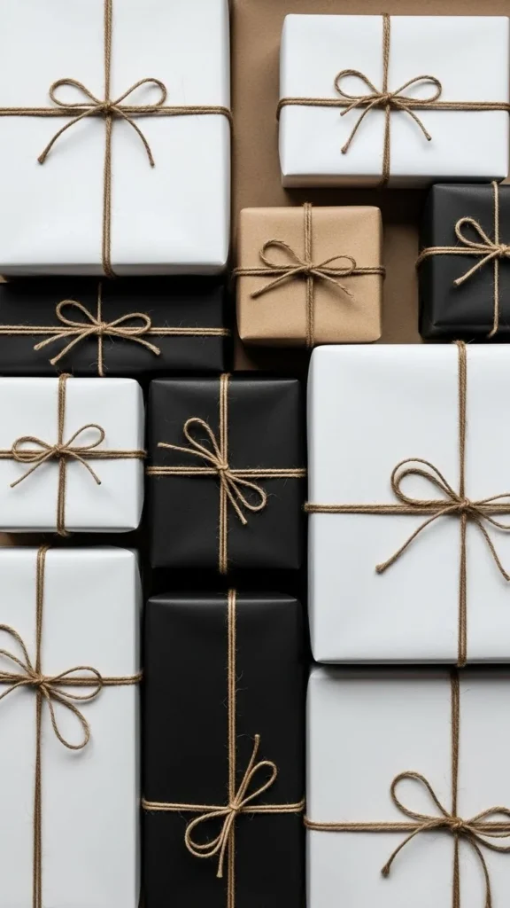 Modern gift wrapping is clean and understated. Use kraft paper, white, or black wrapping paper. Tie gifts with twine, linen ribbon, or cotton string.