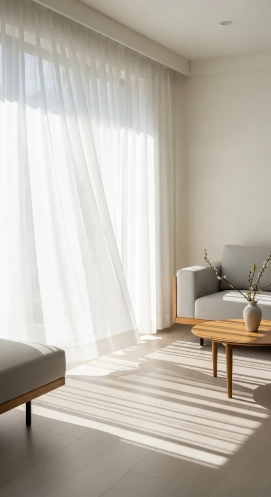 Start with your windows. Heavy curtains hold onto winter energy. Sheer panels let daylight spread across the room. This instantly changes how the space feels. Choose white, cream, or light beige. These shades work with most wall colors.