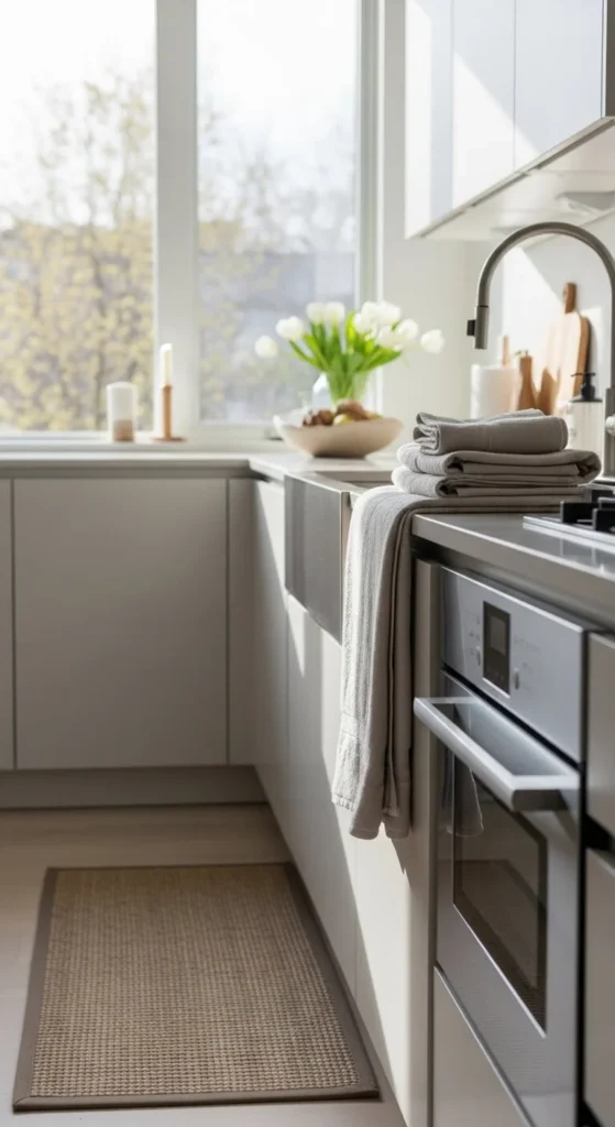 Add a neutral mat near the sink. This adds comfort and style. Wash it often.
