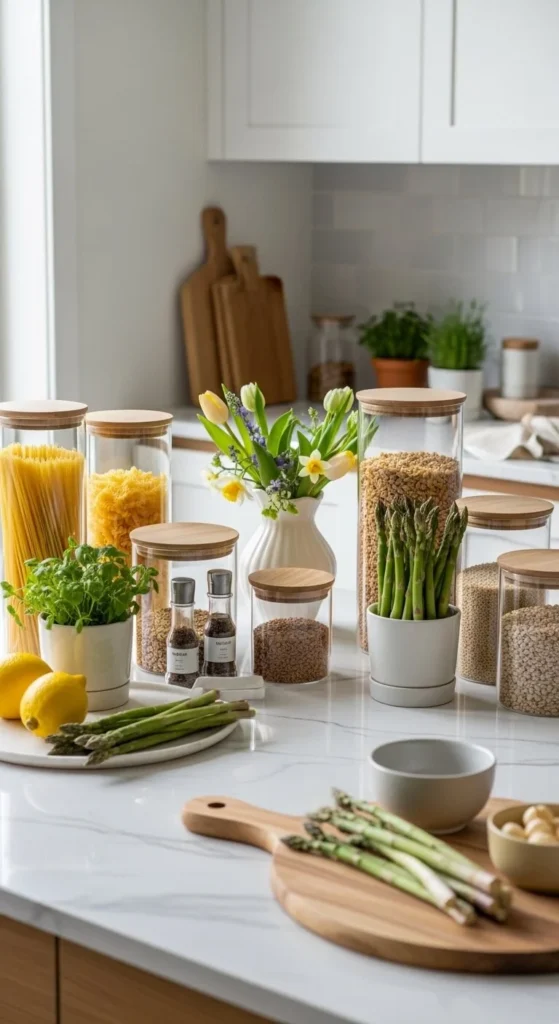 Clear counters feel modern. Replace plastic containers with glass or ceramic where possible.