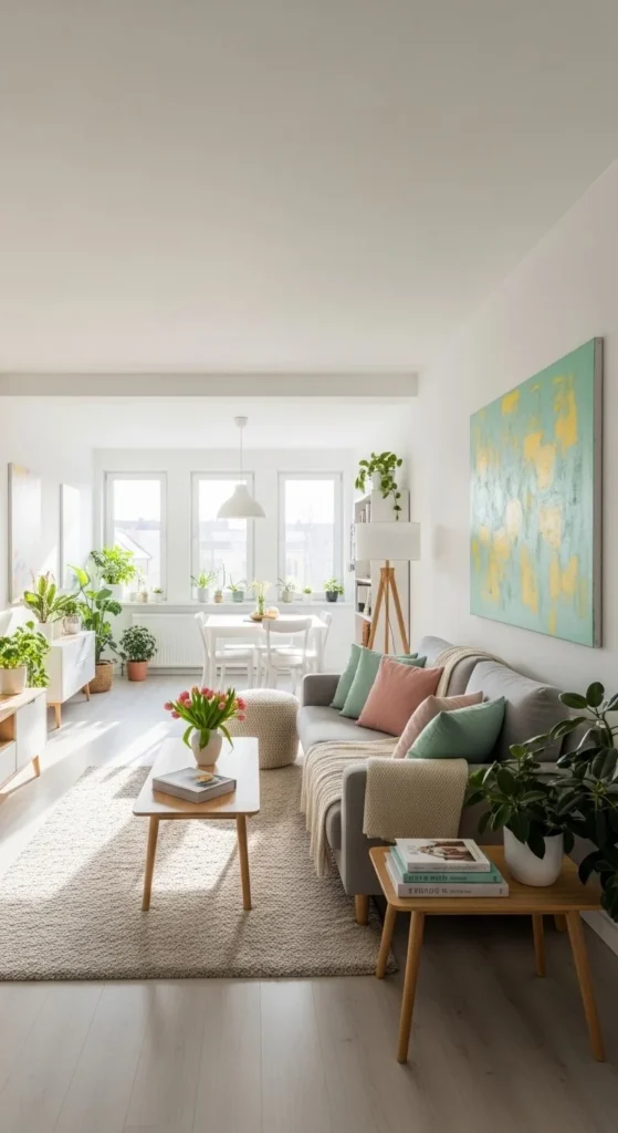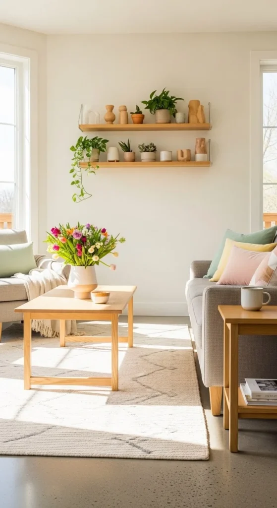 Keep themes simple. Nature photos, line art, or calm abstracts suit spring well. Art should support the room, not compete with furniture.