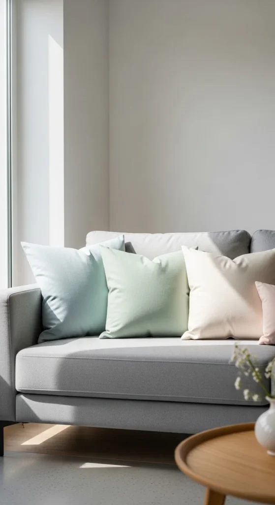 If your sofa is neutral, pillows bring color. If your sofa already has color, use light neutrals instead. This keeps the room calm and open.