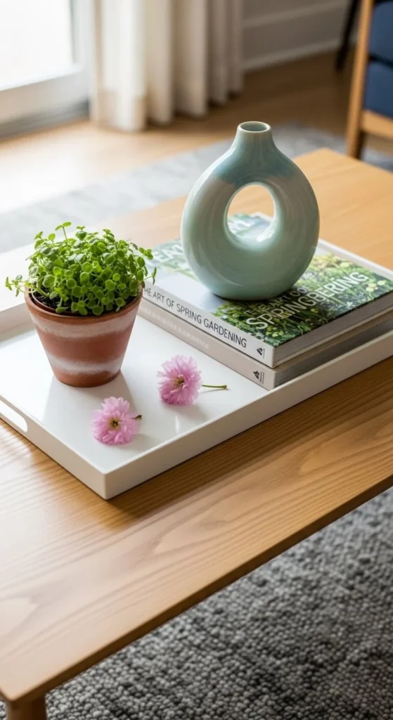 Place only three items inside the tray. A small plant. One book. One object. Keep height varied but balanced. This keeps the table usable.