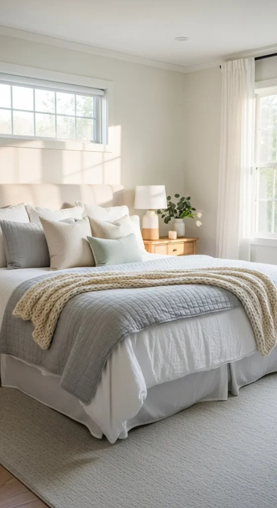 Stick to two colors. White plus one soft shade works best. Layer with texture, not bulk. A thin throw at the foot of the bed adds depth.