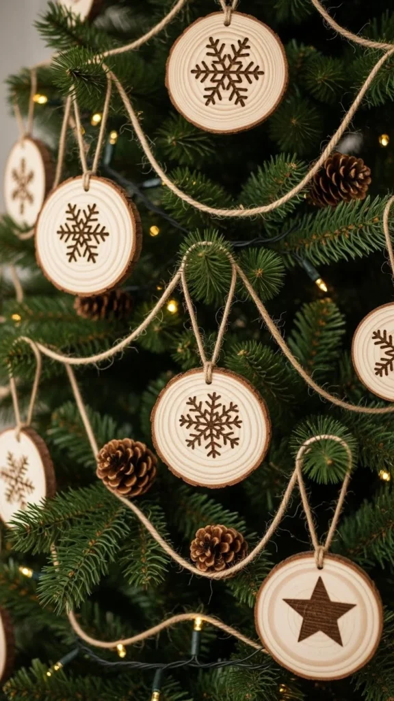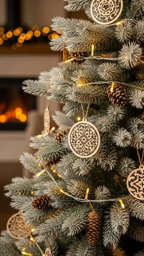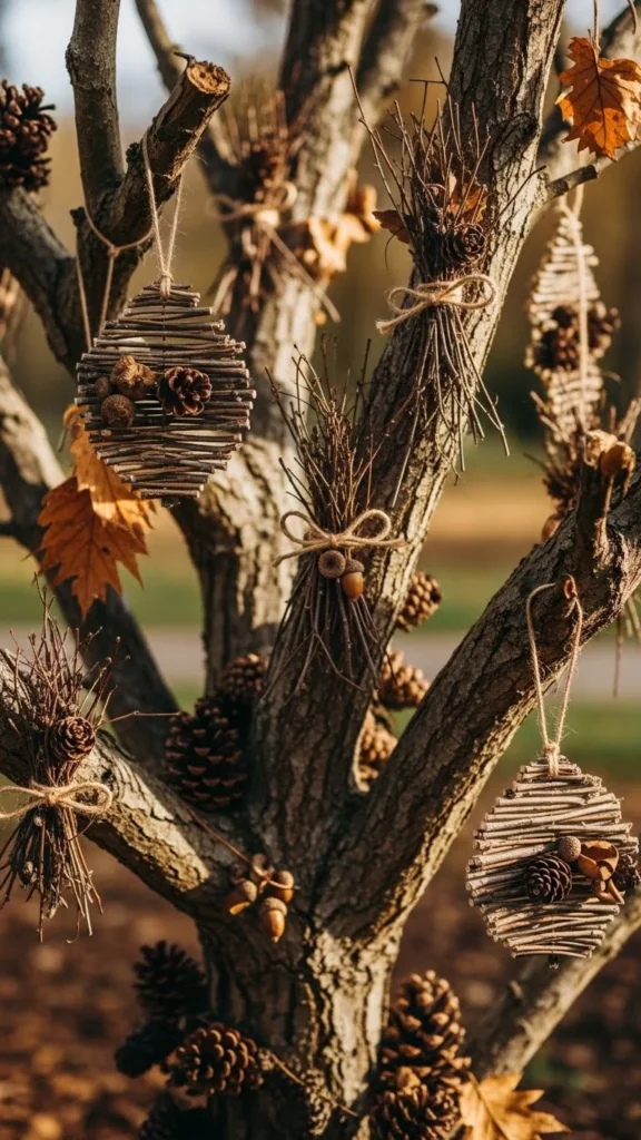 Twig ornaments are easy to make. Gather small branches and glue them into stars, triangles, or cross shapes. Add rope or twine loops. The natural texture brings a forest mood. Pair with simple lights and wooden pieces. This idea is almost free and perfect for a natural look.