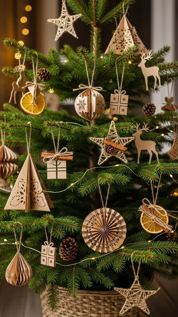 Kraft paper makes charming rustic ornaments. Cut stars, hearts, or circles. Stuff them lightly with tissue and stitch the edges with thread or glue. Add twine loops. These ornaments look warm and simple, and kids can help make them. Mix them with pinecones or dried fruit. The mix of brown and natural green feels earthy and gentle. It’s a perfect low-budget decorating idea.